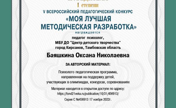 Педагог-психолог МБУ ДО «Центр детского творчества» Баяшкина О.Н. 17 ноября стала победителем I степени в V Всероссийском педагогическом конкурсе «Моя лучшая методическая разработка» за авторский […]