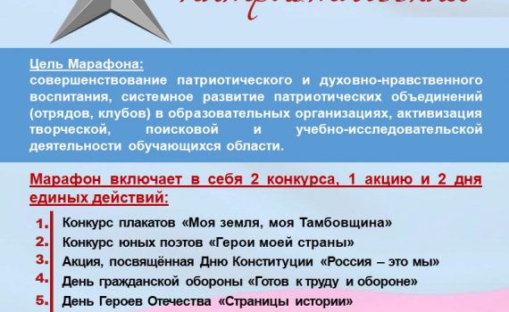 Региональный ресурсный центр патриотического воспитания информирует о запуске дистанционного событийного марафона «Тамбовщина патриотическая» с 16 ноября по 16 декабря 2022 года. Марафон «Тамбовщина патриотическая» проводится […]