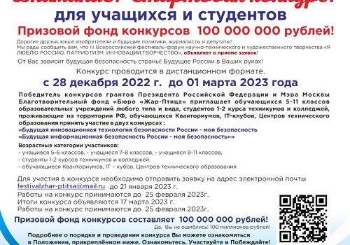 В рамках III Всероссийского фестиваля-форума научнотехнического и художественного творчества «Я люблю Россию. Патриотизм. Инновации. Творчество» стартовали конкурсы «Будущая инновационная технология безопасности России – моя безопасность», […]