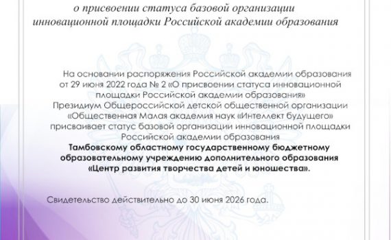 Статус базовой организации инновационной площадки Российской академии образования присвоен нашему учреждению Президиумом Общероссийской детской общественной организации «Общественная Малая академия наук «Интеллект будущего». В данном статусе […]