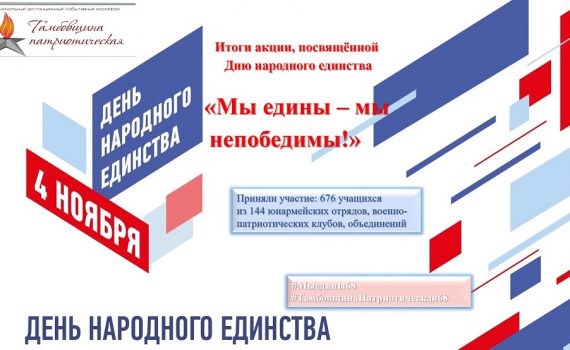 В рамках регионального дистанционного событийного марафона «Тамбовщина патриотическая» прошла акция «Мы едины – мы непобедимы». В акции приняли участие 676 учащихся из 144 юнармейских отрядов, […]